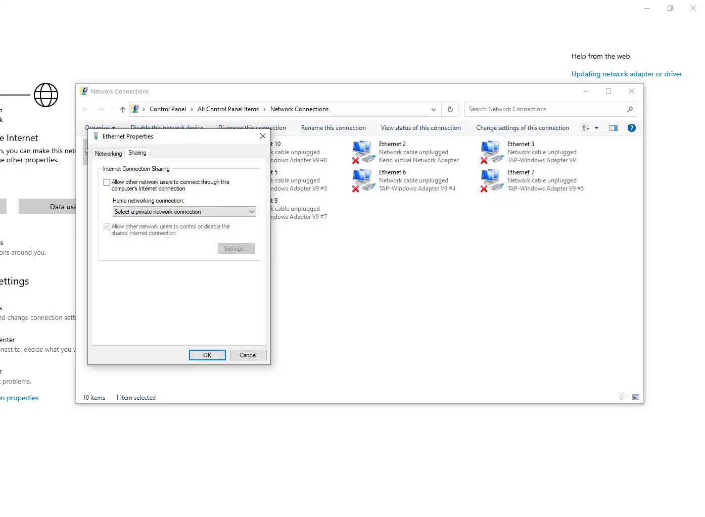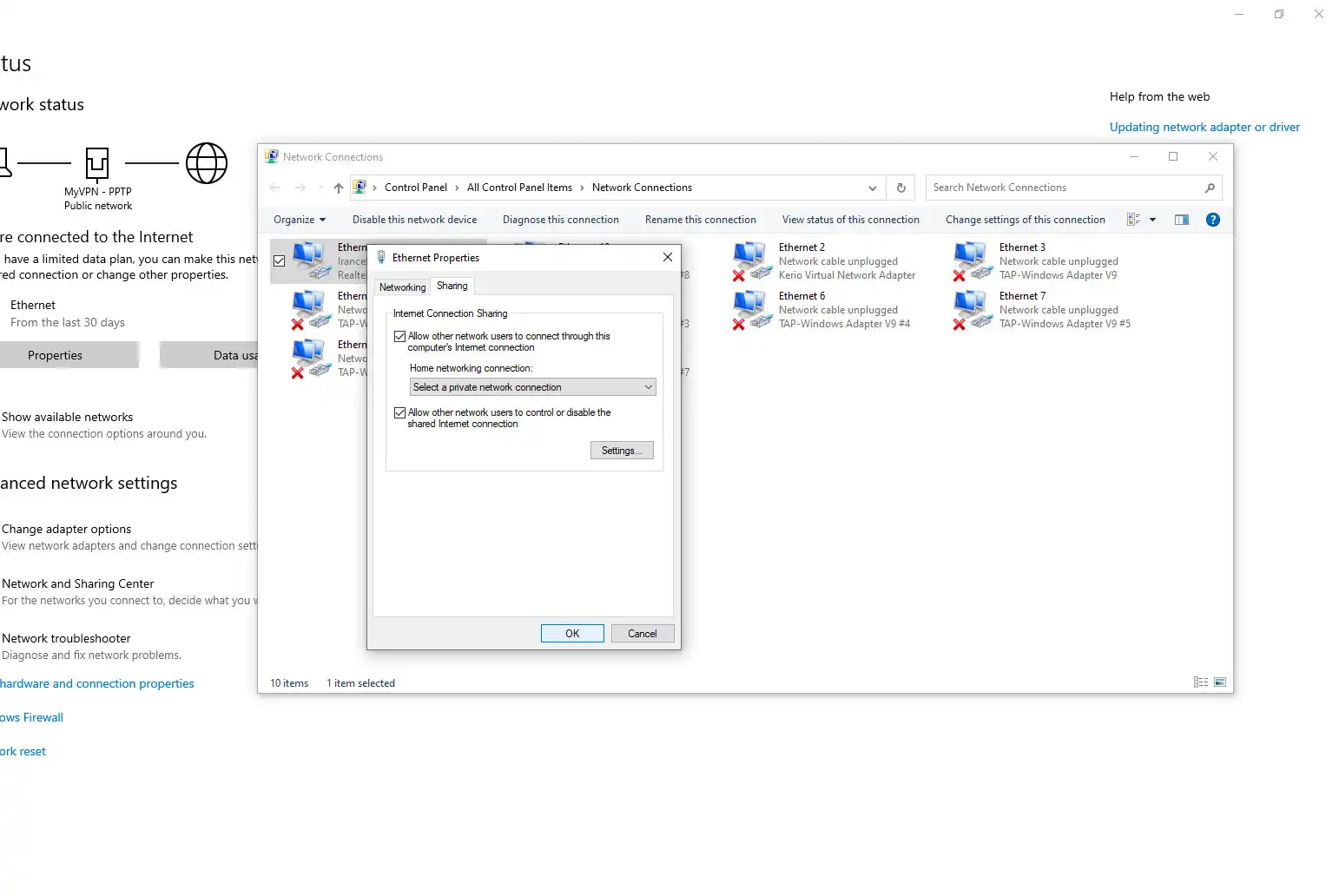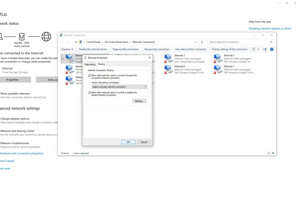 روی کانکشن اینترنت خودتان راست کلیک کنید و Properties را بزنید و از سربرگ Sharing تیک گزینه اولی را بردارید OK را بزنید و مجددا همین کار را انجام دهید. و ایندفعه تیک گزینه اولی را بزنید و باز OK کنید.